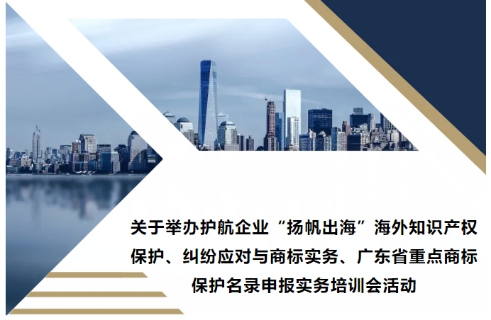 • 關(guān)于舉辦護(hù)航企業(yè)“揚(yáng)帆出海”海外知識產(chǎn)權(quán)保護(hù)、糾紛應(yīng)對與商標(biāo)實(shí)務(wù)、廣東省重點(diǎn)商標(biāo)保護(hù)名錄申報(bào)實(shí)務(wù)培訓(xùn)會活動